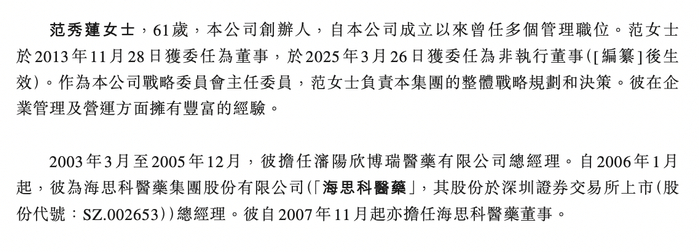 资料显示,范秀莲,现年61岁,公司创办人,自公司成立以来曾任多个管理职位。范秀莲于2013年11月28日获委任为董事,于2025年3月26日获委任为非执行董事。作为公司战略委员会主任委员,范秀莲负责集团的整体战略规划和决策。其在企业管理及营运方面拥有丰富的经验