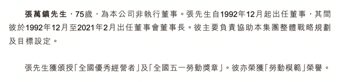 资料显示,张万镇,75岁,为公司非执行董事。张万镇自1992年12月起出任董事,其间于1992年12月至2021年2月出任董事会董事长。其主要负责协助集团整体战略规划及目标设定。