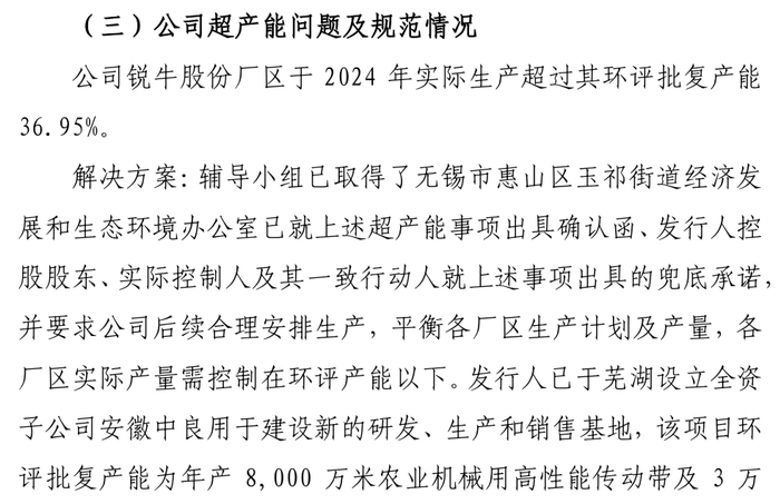 辅导小组已取得了无锡市惠山区玉祁街道经济发展和生态环境办公室已就上述超产能事项出具确认函、公司控股股东、实际控制人及其一致行动人就上述事项出具的兜底承诺, 并要求公司后续合理安排生产,平衡各厂区生产计划及产量,各厂区实际产量需控制在环评产能以下。
