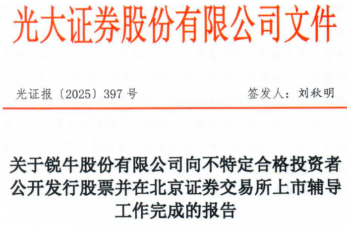 瑞财经 严明会 近日,锐牛股份有限公司(以下简称:锐牛股份)披露北交所IPO辅导工作完成报告,辅导机构光大证券。