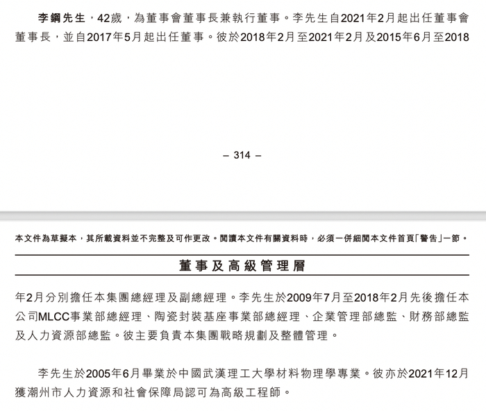 李钢自2021年2月起出任董事会董事长,并自2017年5月起出任董事。其于2018年2月至2021年2月及2015年6月至2018年2月分别担任集团总经理及副总经理。李钢于2009年7月至2018年2月先后担任公司MLCC事业部总经理、陶瓷封装基座事业部总经理、企业管理部总监、财务部总监及人力资源部总监。其主要负责集团战略规划及整体管理。