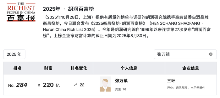 值得一提的是,今年10月28日,2025胡润百富榜发布,张万镇以220亿元财富位列榜单第284位,潮州第一。
