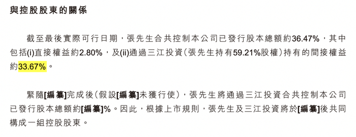 IPO前,张万镇合共控制公司已发行股本总额约36.47%,其中包括直接权益约2.80%,及通过三江投资(张万镇持有59.21%股权)持有的间接权益约33.67%。