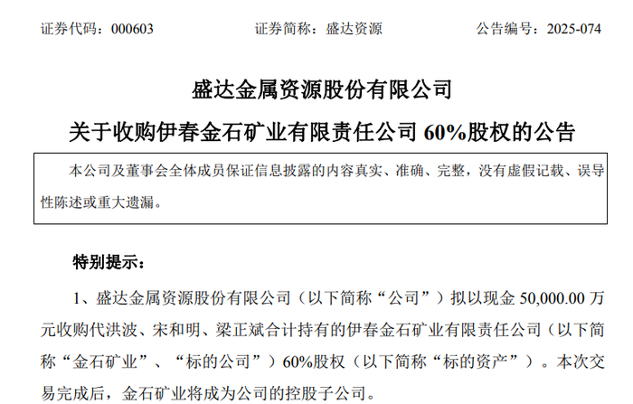 盛达资源表示,交易不构成关联交易和重大资产重组,无需股东大会审议。交易对方代洪波、宋和明、梁正斌均非失信被执行人,与盛达资源无关联关系。