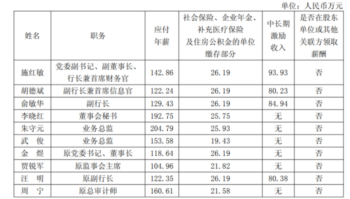 副行长兼首席信息官胡德斌年薪228.66万元,副行长俞敏华薪酬240.56万元,董秘李晓红薪酬合计218.5万元,原副行长汪明228.92万元,