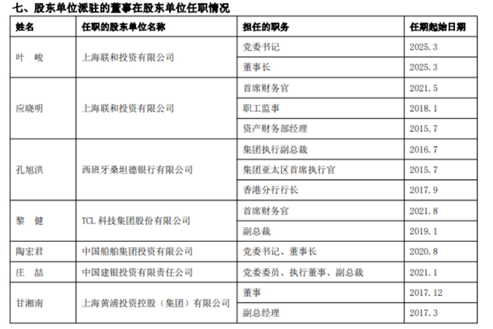 要知道,上海银行的非执行董事,都是来自于股东单位。像是叶峻、应晓明来自上海联合投资,孔旭洪来自西班牙桑坦德银行,黎健来自TCL科技集团。