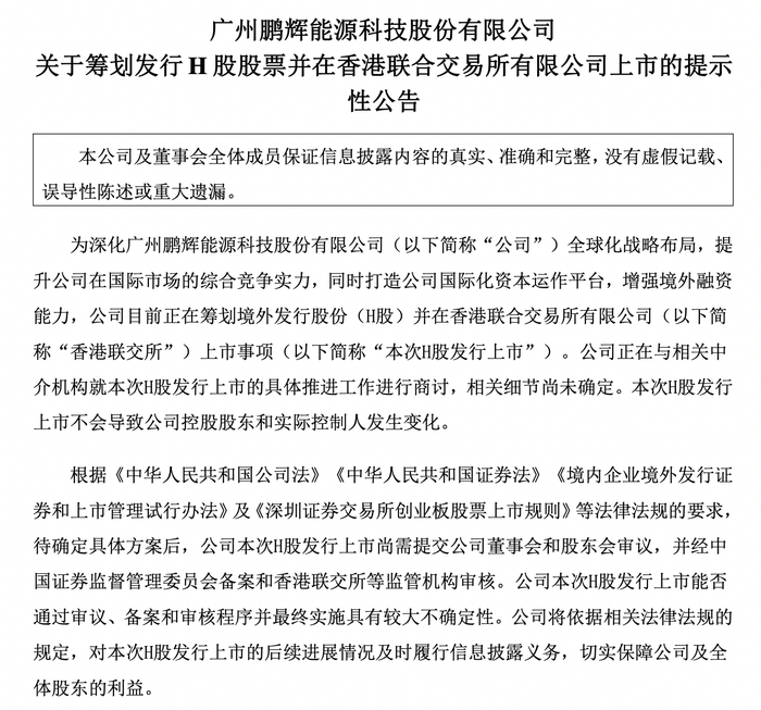 鹏辉能源表示,公司正在与相关中介机构就本次H股发行上市的具体推进工作进行商讨,相关细节尚未确定。本次H股发行上市不会导致公司控股股东和实际控制人发生变化。本次H股发行上市能否通过审议、备案和审核程序并最终实施具有较大不确定性。