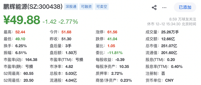 截至当日收盘,鹏辉能源报49.88元,跌2.77%,总市值约251.07亿元。