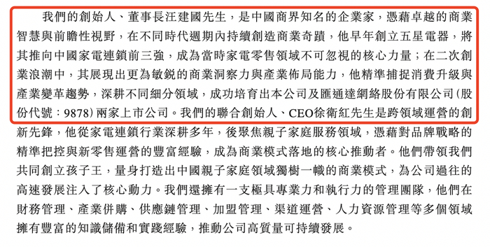 资料显示,孩子王的创始人、董事长汪建国,是中国商界知名的企业家,南京创投大佬,他早年创立五星电器,将其推向中国家电连锁前三强,成为当时家电零售领域不可忽视的核心力量;在二次创业浪潮中,他精准捕捉消费升级与产业变革趋势,深耕不同细分领域,成功培育出公司(股票代码:301078)及汇通达网络股份有限公司(股份代号:9878)两家上市公司。