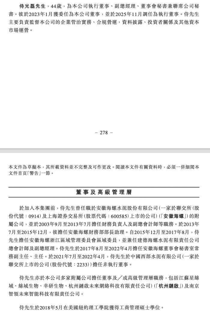 另外,侍光磊,44岁,为公司执行董事、副总经理、董事会秘书兼联席公司秘书。其于2023年1月获委任为公司董事,并于2025年11月调任为执行董事。侍光磊主要负责监督公司的企业管治实务、合规营运、资料披露、投资者关系及其他资本市场运营。