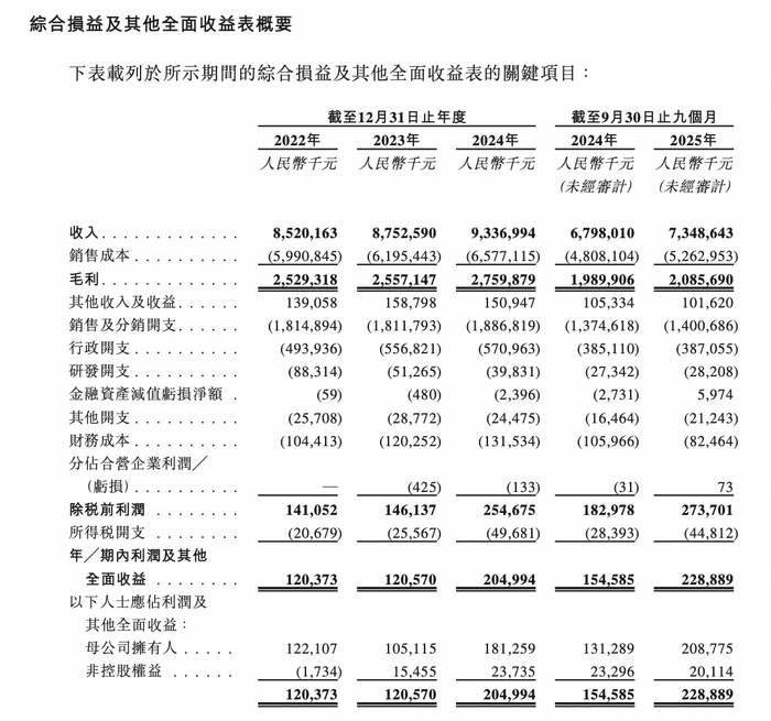 据招股书,2022年-2024年,孩子王实现收入分别为85.2亿元、87.53亿元、93.37亿元;年内利润及其他全面收益分别为1.2亿元、1.21亿元、2.05亿元。
