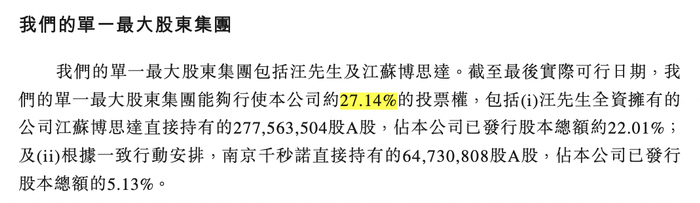 截至最后实际可行日期,公司的单一最大股东集团能够行使公司约27.14%的投票权,包括汪建国全资拥有的公司江苏博思达直接持有的277,563,504股A股,占公司已发行股本总额约22.01%;及根据一致行动安排,南京千秒诺直接持有的64,730,808股A股,占公司已发行股本总额的5.13%。