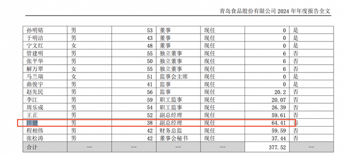 2024年,田健从青岛食品获得的税前报酬总额64.41万元。