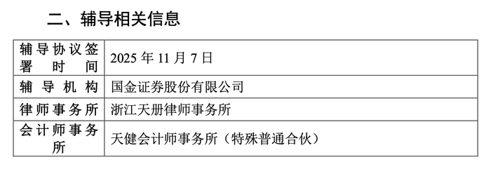 本次IPO的辅导机构为国金证券股份有限公司,律师事务所为浙江天册律师事务所,会计师事务所为天健会计师事务所(特殊普通合伙)。