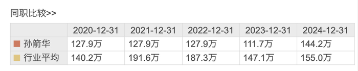 东方财富数据显示,2020年只2024年,孙箭华薪酬分别为127.9万元、127.9万元、127.9万元、111.7万元、144.2万元。