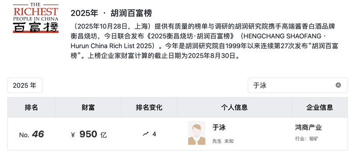 据《2025年胡润百富榜》,于泳的财富达950亿,排在第46名。