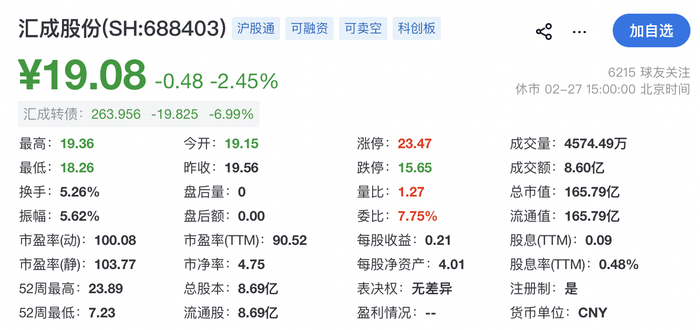 截至发稿时,汇成股份报19.08元,总市值约165.79亿元。