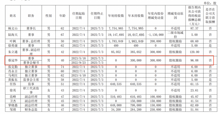 2024年年度报告显示,蔡冠华报告期内从公司获得的税前报酬总额96.08万元,而时任董事长杨文山薪酬87.37万元,总经理叶枫薪酬68.6万元。