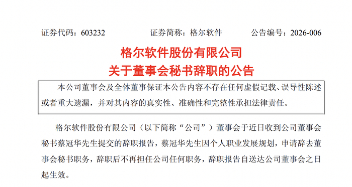 瑞财经 刘治颖3月6日,格尔软件(SH603232)公告,蔡冠华因个人职业发展规划,申请辞去董事会秘书职务,辞职后不再担任公司任何职务,辞职报告自送达公司董事会之日起生效。