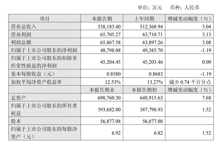 2025年,公司实现营业收入53.82亿元,同比增长5.04%;利润总额6.59亿元,同比增长3.08%;归属于上市公司股东的净利润4.88亿元,同比减少1.19%。