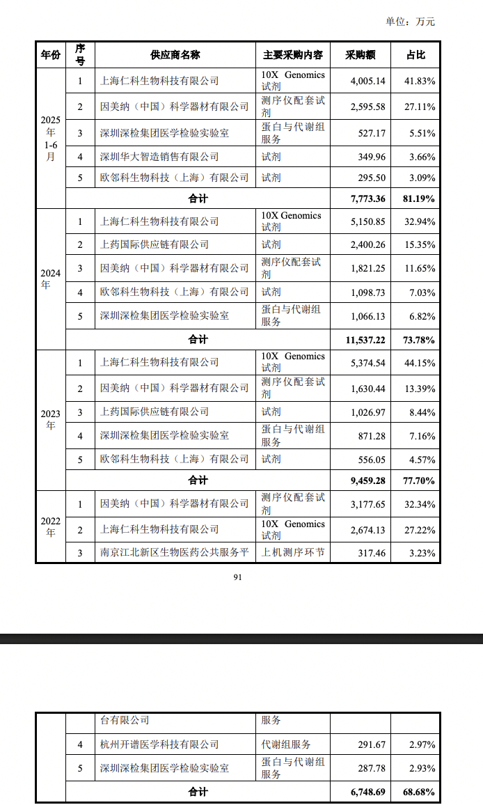 联川生物表示,报告期内,公司前五大供应商的采购金额占当期原材料与服务采购总额的比例为68.68%、77.70%、73.78%及81.19%,采购的主要内容系测序配套试剂、10X试剂、蛋白代谢组学服务等。