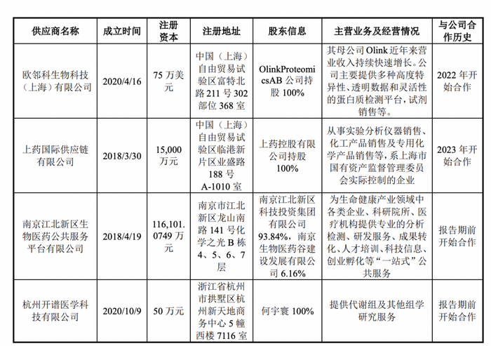 委外服务采购方面,南京江北新区生物医药公共服务平台有限公司和杭州开谱医学科技有限公司在2022年系公司前五大供应商,但随着公司自主测序产能的提升,测序环节委外服务减少,2023年南京江北新区生物医药公共服务平台有限公司已退出主要供应商,同时,公司经综合考量,选择了在蛋白代谢组学委外服务方面更具竞争优势的深圳深检集团医学检验实验室,因此,自2023年起杭州开谱医学科技有限公司退出主要供应商,委外采购服务的主要供应商为深圳深检集团医学检验实验室,具有稳定性。