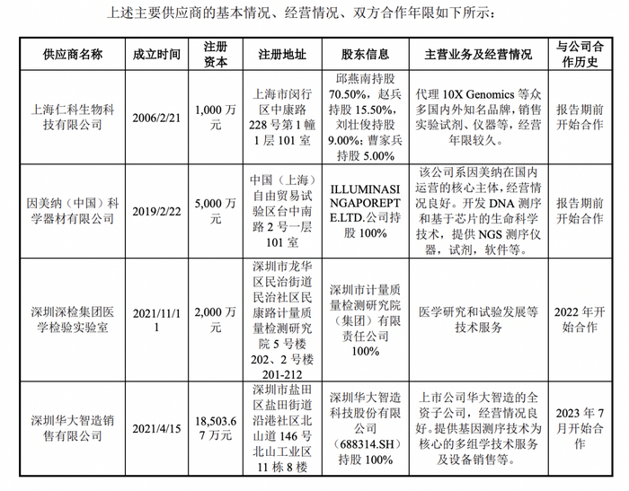 报告期内,公司前五名供应商基本保持稳定。主要变化情况为:原材料采购方面,报告期内新增三家主要供应商,分别为深圳华大智造销售有限公司、欧邻科生物科技(上海)有限公司及上药国际供应链有限公司:新增华大智造主要系公司布局华大测序平台后,试剂采购量增加,新增欧邻科主要系基于公司Olink业务的快速增长,上药国际系因美纳代理商,采购内容仍然为因美纳测序试剂,公司对因美纳测序试剂的采购保持稳定增长,具有稳定性。