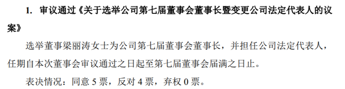独立董事李毅投反对票,他认为按照公司所处行业特许资质的相关法律法规要求,董事长及法定代表人应符合任职资格审查等法定要求,但梁丽涛目前尚未完成任职资格审查。现阶段变更其为董事长及法定代表人可能会影响公司行业特许资质的存续,可能会影响公司及全体股东的合法利益。