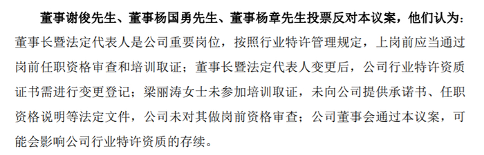 董事谢俊、杨国勇、杨章投反对票,理由是董事长暨法定代表人是公司重要岗位,按照行业特许管理规定,上岗前应当通过岗前任职资格审查和培训取证;董事长暨法定代表人变更后,公司行业特许资质证书需进行变更登记。