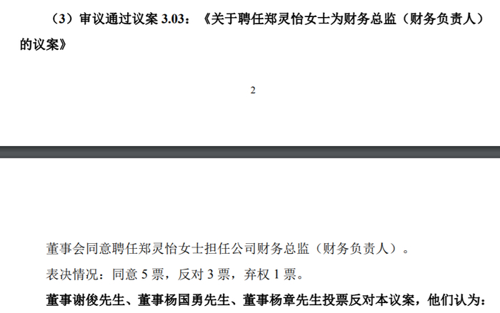 另外,关于聘任郑灵怡为财务总监的议案表决情况为同意5票,反对3票,弃权1票,提出反对票的董事也指出了相关的任职资格审查问题。正值公司年报编制期间,郑灵怡尚未提供相关审查材料。