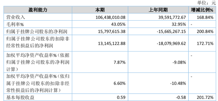 业绩方面,2025年上半年,公司实现营收1.06亿元,同比增168.84%;归属于挂牌公司股东的净利润1579.76万元,同比扭亏为盈。