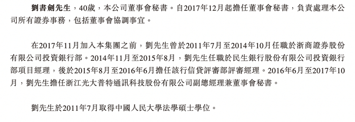 在2017年11月加入集团之前,刘书剑曾于2011年7月至2014年10月任职于浙商证券股份有限公司投资银行部。2014年11月至2015年8月,刘书剑任职于民生银行股份有限公司投资银行 部项目经理,后于2015年8月至2016年6月担任该行信贷评审部评审经理。2016年6月至2017年10月,刘书剑担任浙江光大普特通讯科技股份有限公司副总经理兼董事会秘书。