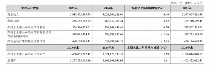 2025年,金徽酒实现营业收入29.18亿元,同比减少3.4%;归属于上市公司股东的净利润3.54亿元,同比减少8.7%;归属于上市公司股东的扣除非经常性损益的净利润3.48亿元,同比减少10.36%。