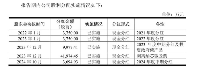 天博智能IPO前累计分红6.3亿元,2023年的年度分红金额高达5.2亿元,其中,因中期分红及投资政府债产品分红9,977.41万元,因剥离纳芯微股票分红4.2亿元。