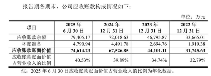 2022年-2025年上半年,天博智能的应收账款账面价值为3.17亿元、4.41亿元、6.75亿元及7.46亿元,占比营业收入的32.79%、34.74%、39.89%及40.53%。(2025年上半年数据已年化),占比逐年上升。