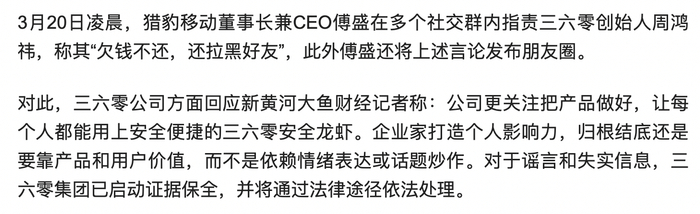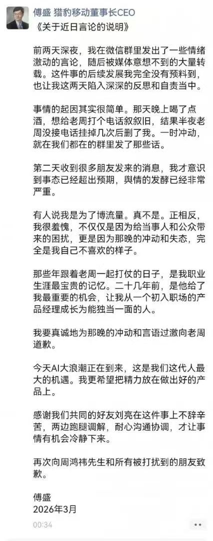 瑞财经 吴文婷 3月24日,据媒体报道,猎豹移动董事长傅盛发文向360集团创始人周鸿祎致歉,回应数日前指责后者一事。