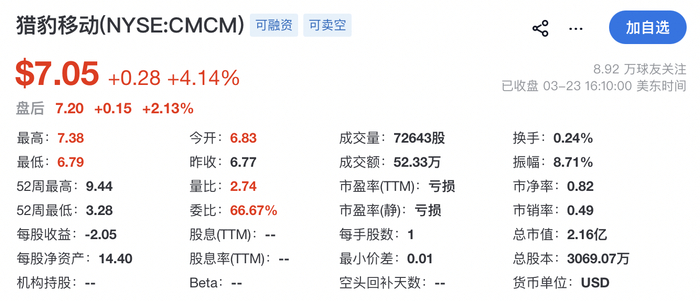 截至发稿时,三六零股价报10.74元,总市值约751.75亿元;猎豹移动股价报7.05美元,总市值约2.16亿美元。