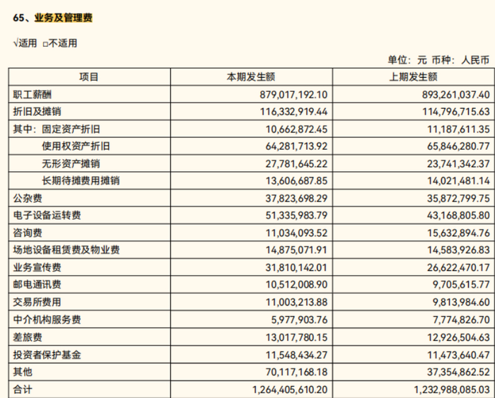 其中,首创证券业务及管理费为12.64亿元,同比增长2.55%。而职工薪酬为8.79亿元,同比下降了1.56%。