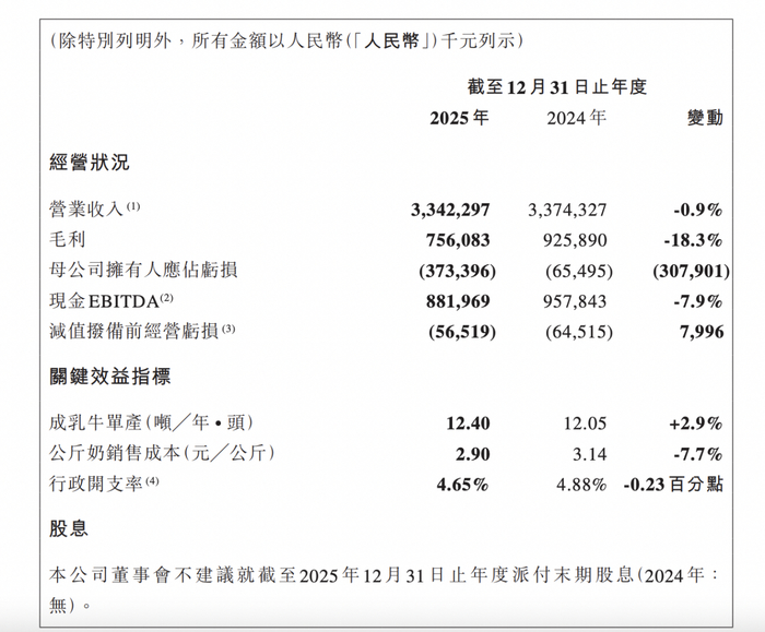 2025年,中国圣牧营业收入为33.42亿元,同比减少0.9%;母公司拥有人应占亏损3.73亿元,上年同期亏损0.65亿元;现金EBITDA为8.82亿元,同比减少7.9%;综合毛利率为25.1%,较上年同期的29.6%下降4.5个百分点。董事会不建议派付末期股息。