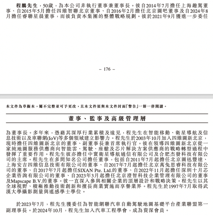 其中,程鹏,50岁,为公司非执行董事兼董事长。其自2014年7月担任上海趣驾董事、自2015年5月担任四维智联北京董事、自2016年2月担任北京图吧董事及自2024年8月担任睿联星晨董事,而其负责集团的整体战略规划。其于2021年9月获进一步委任为董事长。