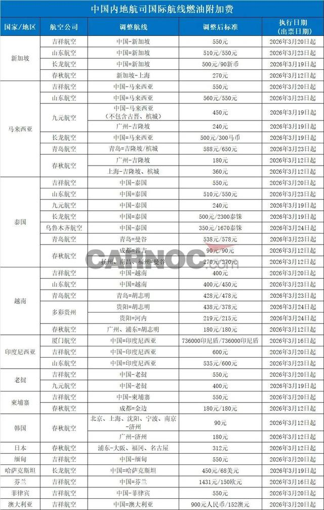 3月25日,春秋航空发布公告称,国内航线燃油附加费将于4月5日零时起上调。