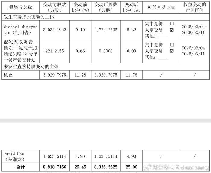 3 月 12 日,科创板上市医疗器械企业三友医疗(688085)发布实控人权益变动公告,披露公司核心实控人及一致行动人在近期完成了一轮大额减持。投资参考网记者从公告核心信息中梳理确认,2026 年 2 月 4 日至 2026 年 3 月 11 日期间,公司实控人之一 MichaelMingyan Liu(刘明岩)通过大宗交易方式,合计减持公司股份260.94 万股,占公司总股本的 0.78%;另一实控人徐农的一致行动人混沌天成 18 号,同期通过大宗交易合计减持公司股份221.22 万股,占公司总股本的 0.66%。