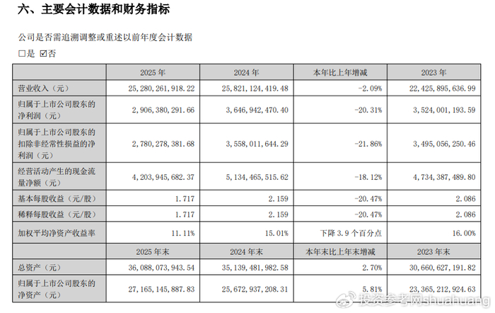 3月26日,北新建材(000786.SZ)正式发布2025年年度报告。投资参考网记者梳理财报数据发现,公司全年实现营业收入252.80亿元,同比微降2.09%;归属于上市公司股东的净利润为29.06亿元,同比大幅下降20.31%。