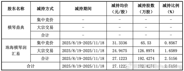 西点药业公告显示,截至本次减持计划披露日,横琴鼎典与横琴润汇易合计持有公司股份719.56万股,占公司剔除回购股份后总股本的9.53%,所持股份均为公司首次公开发行前取得的股份。
