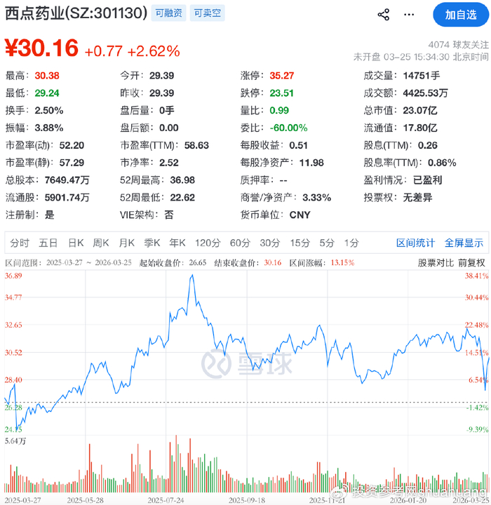 截至3月25日收盘,西点药业股价报30.16元/股,单日涨幅2.62%,总市值23.07亿元。
