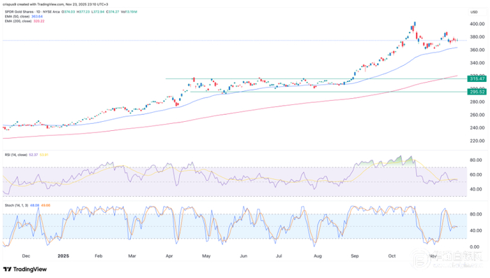 即使有可能回落到这个窄幅区间,预计GLD黄金ETF也将稳定在360美元的较低支撑区域上方。值得注意的是,自10月6日首次反弹以来,GLD黄金ETF一直高于这一水平。