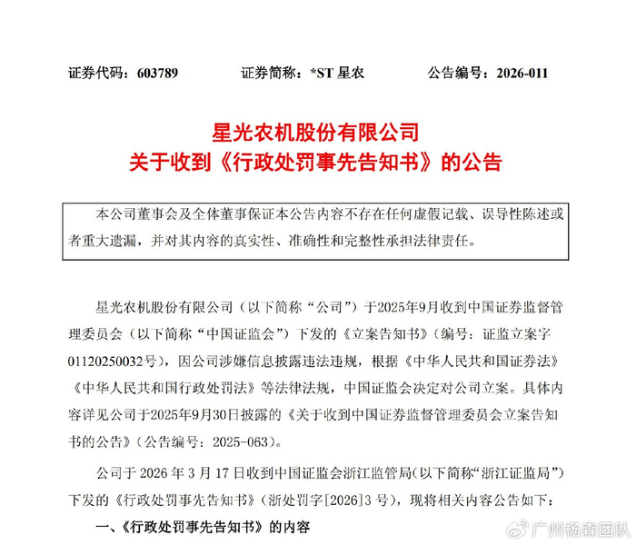 2026年3月18日,星光农机股份有限公司(公司或星光农机)披露,收到浙江证监局下发的《行政处罚事先告知书》。