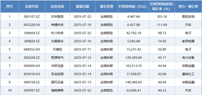 在这40家上市公司中,归母净利润增幅最大的是沃华医药(002107.SZ),该公司上半年实现归母净利润4467.64万元,同比增长303.16%。沃华医药表示,公司持续聚焦主业,依托独家产品线,大力实施学术推广,落实精细化管理要求,强化“一降三增”(即降成本费用、增销售、增效率、增现金)战略落地,经营业绩实现同比增长。紧随其后的是神通科技(605228.SH)、长川科技(300604.SZ),归母净利润同比增幅分别为111.09%、98.73%。
