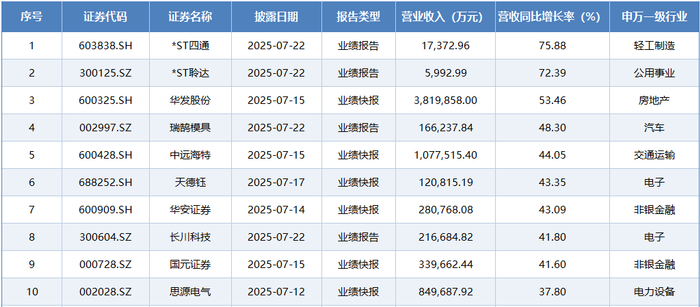 从目前披露的情况来看,营收增幅最高的是*ST四通(603838.SH),该公司实现营业收入约1.74亿元,同比增长75.88%。*ST四通表示,公司合并层面新增控股子公司大连壹唯新材料有限公司,导致公司上半年营业收入大幅增加。紧随其后的分别是*ST聆达(300125.SZ)和华发股份(600325.SH),营收增幅分别为72.39%和53.46%。