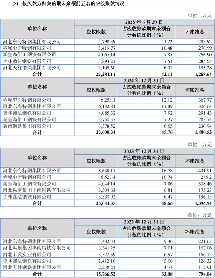 2022年至2025年6月,公司前五名客户销售收入及占当期营业收入比例情况如下: